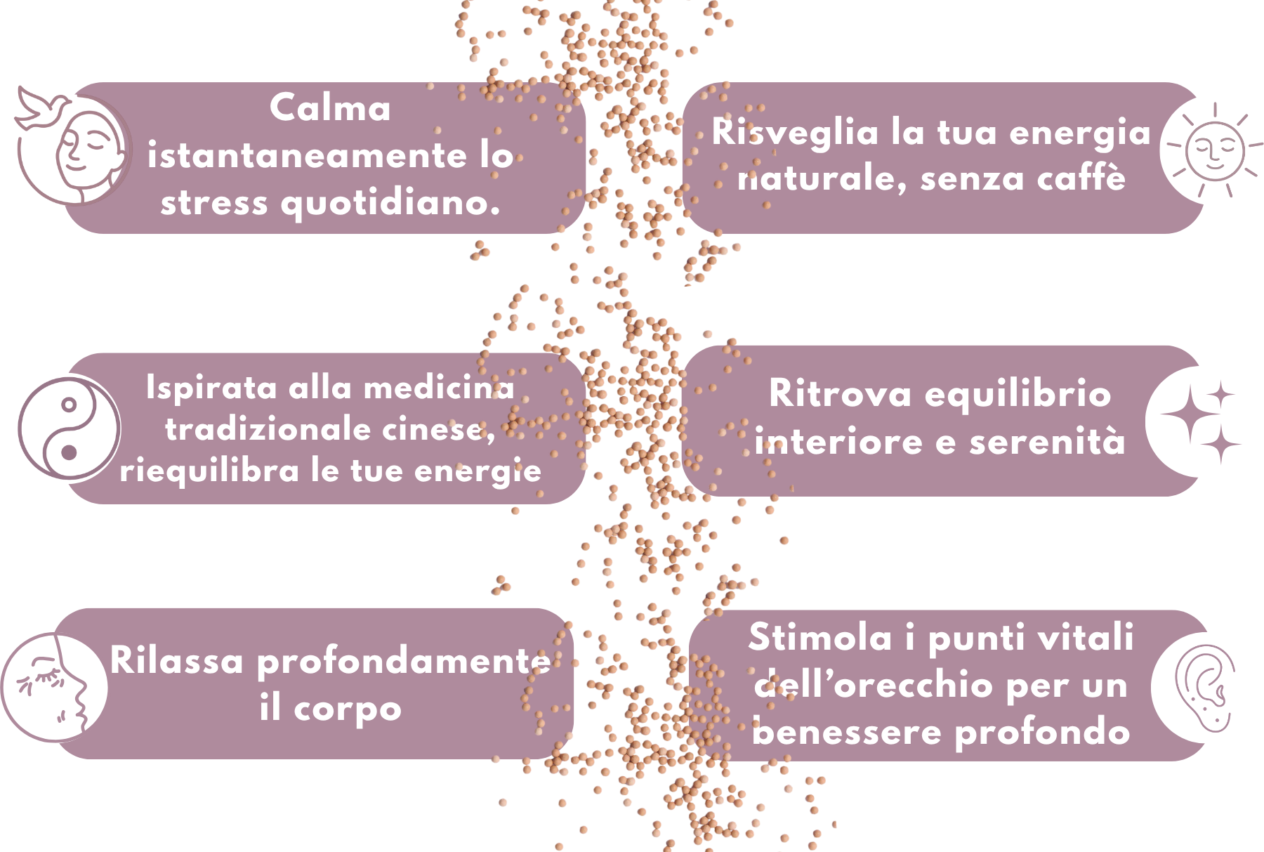 I nostri Punti di Serenità utilizzano piccole sfere energetiche realizzate con minerali e ingredienti naturali che stimolano delicatamente i punti chiave dell’orecchio, favorendo equilibrio, circolazione e vitalità della pelle.