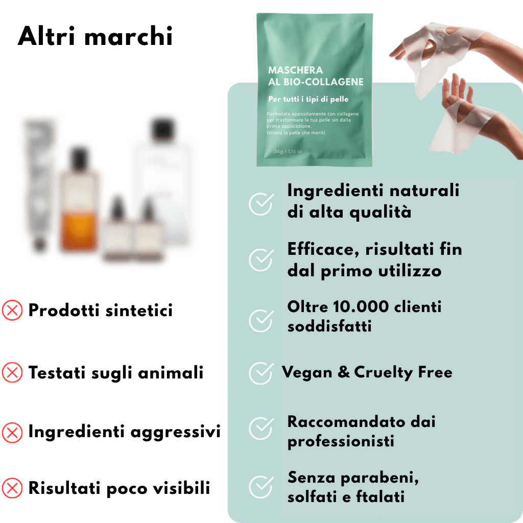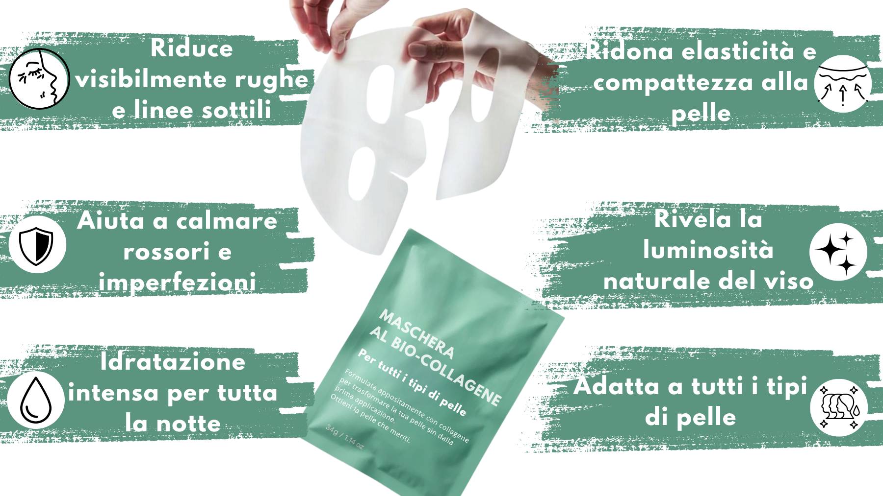 Per risultati ottimali consigliamo di integrare la maschera al collagene 1–2 volte a settimana nella tua routine serale di skincare.