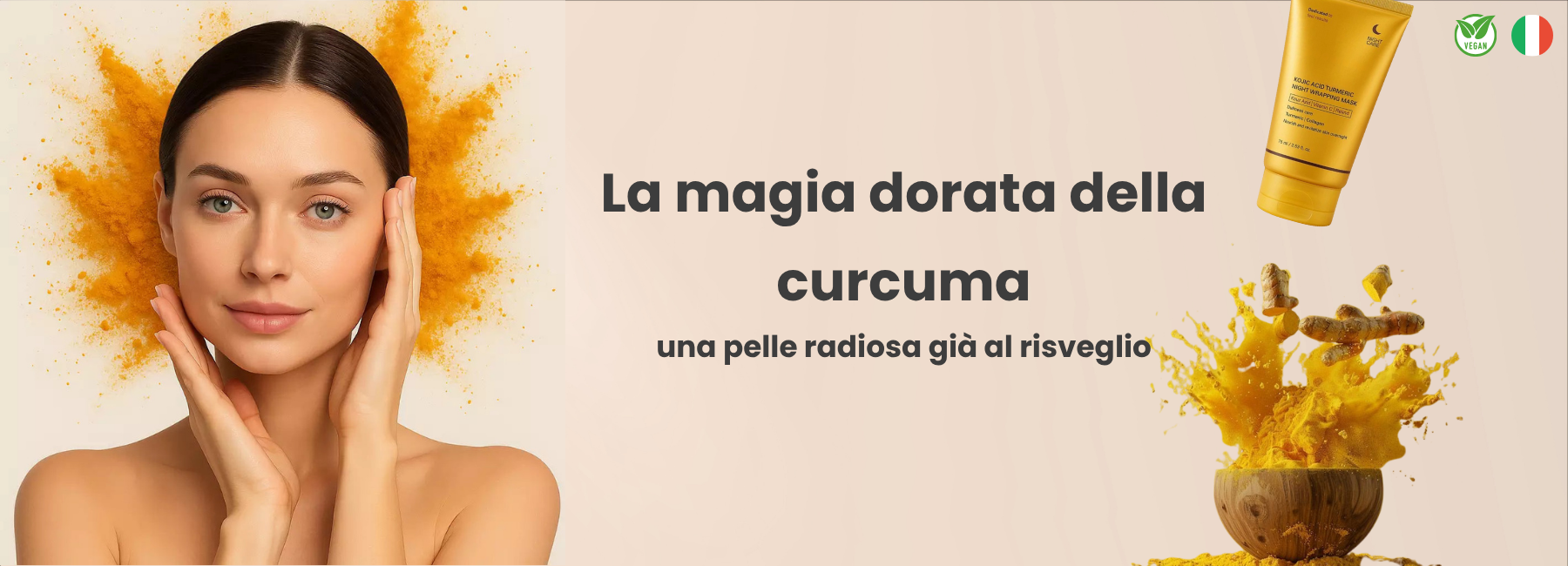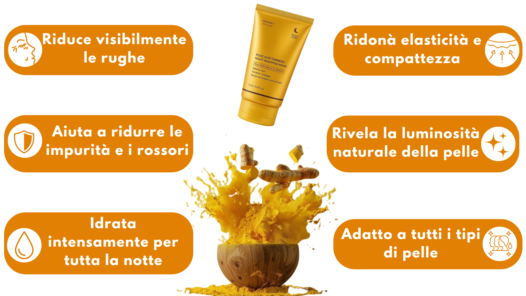 Il collagene rassoda la pelle, la curcuma e la vitamina C illuminano l’incarnato, mentre il retinolo agisce delicatamente per levigare le rughe.